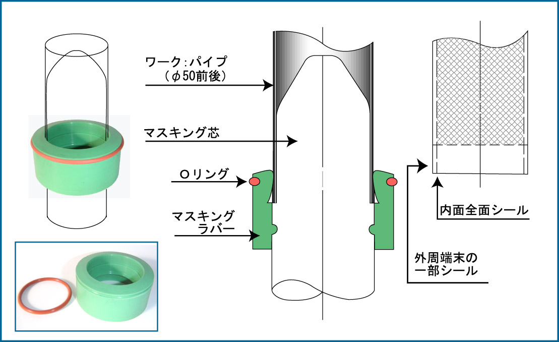 ゴムの熱膨張によりマスキングの径が広がり、外形をシールする力が弱くなるため、対策として外径に「Oリング}を装着。確実なシール力をキープしました。